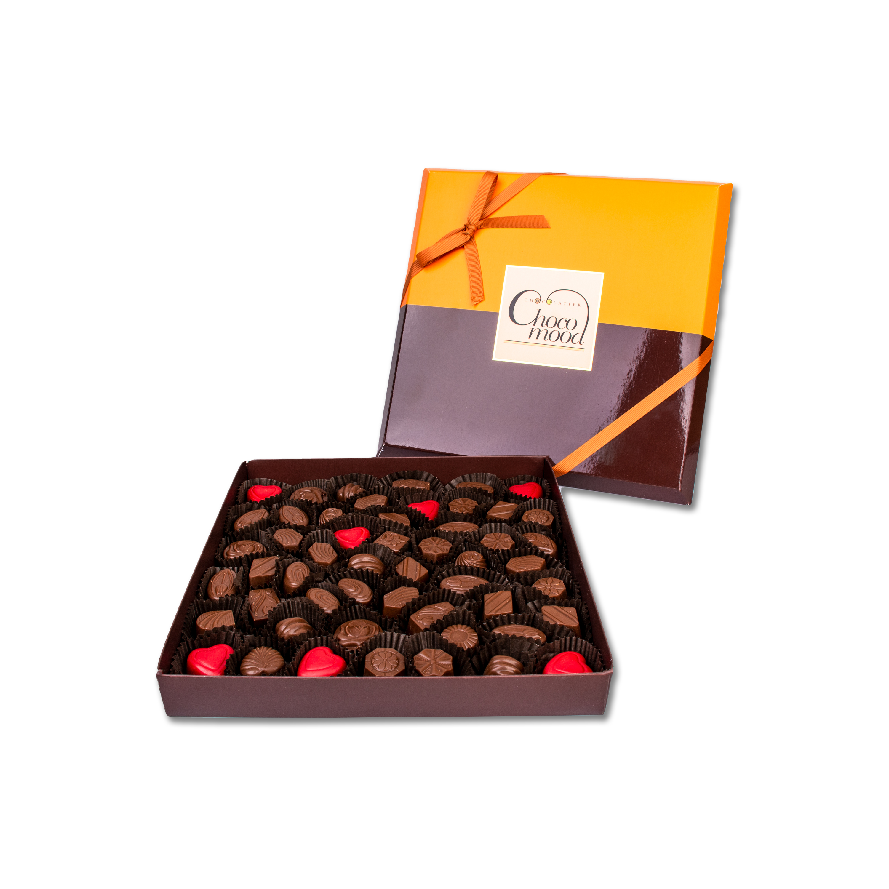 A special open chocolate box contains approximately 50 pieces. With fillings of chocolate cream and nuts with a distinctive taste